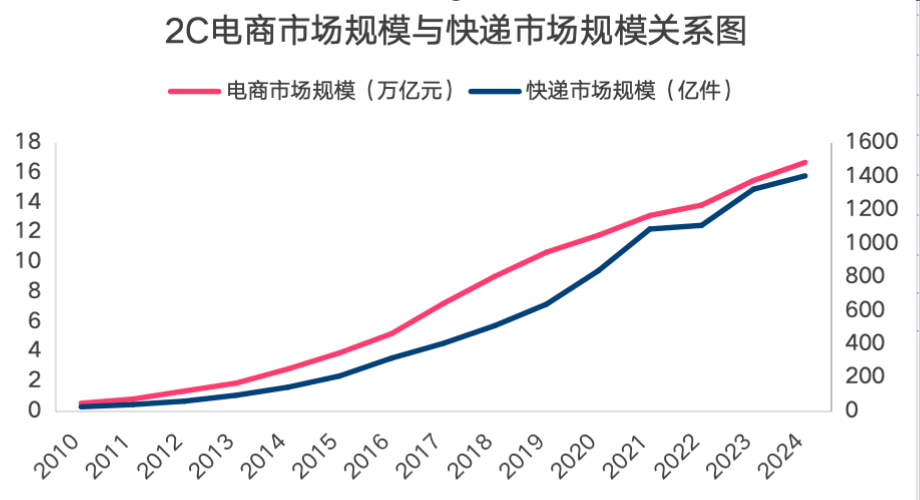 咱们看一下2C电商市场规模与快递市场规模的干系,如下图。
