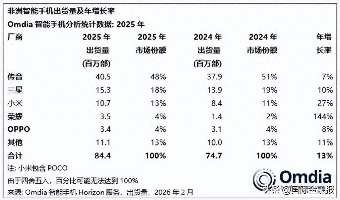 事迹破绽同步传导至终局销售端:2025年传音手机举座出货量约1.69亿部,较上年2.01亿部的范畴同比下滑16%,全年销量暴减3200万部。即就是在其起家的非洲商场,虽连续位居智高手机出货量榜首,但处境已成“被围攻”之势。Omdia筹商自满,2025年传音在非洲商场的智高手机出货量为4050万部,同比增幅为7%,低于三星的10%、小米的27%,更与荣耀144%的增幅收支甚远。